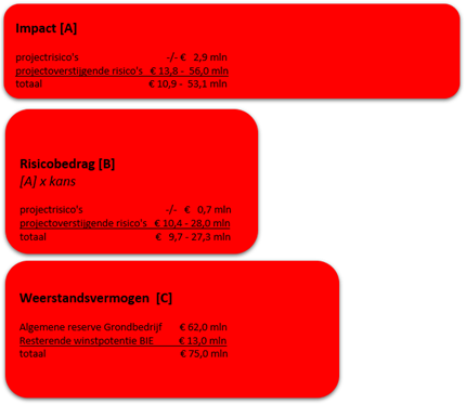 De impact van de project-overstijgende risico’s ligt tussen de € 13,8 en € 56,0 miljoen. Het risicobedrag ligt tussen de € 10,4 en € 28,0 miljoen.