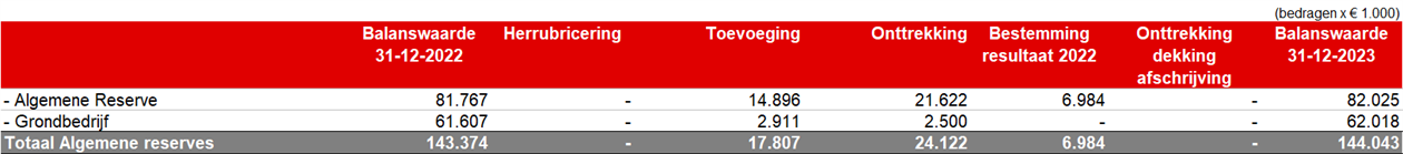 Totaal Algemene reserves | 143.374 | - | 17.807 | 24.122 | 6.984 | - | 144.043 |