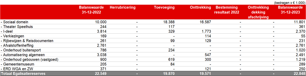 Het verloop van de egalisatiereserves in 2023 is in onderstaand overzicht weergegeven.