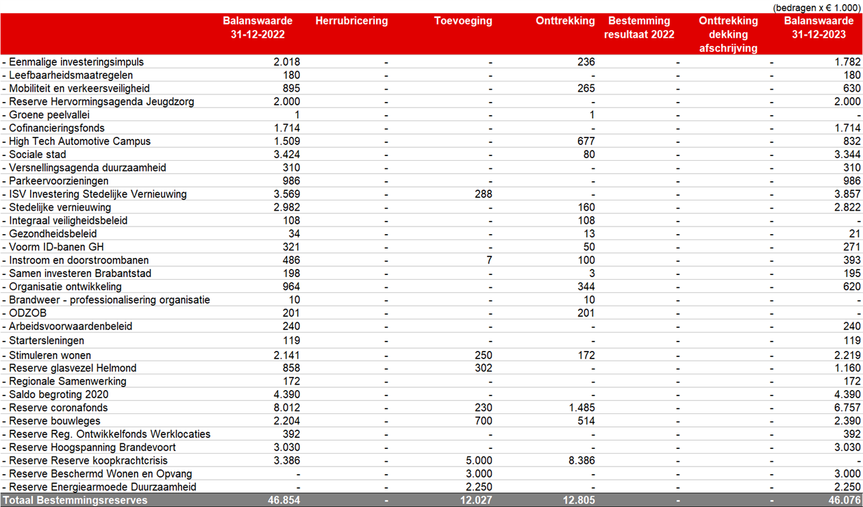 Het verloop van de overige bestemmingsreserves in 2023 is in onderstaand overzicht weergegeven.