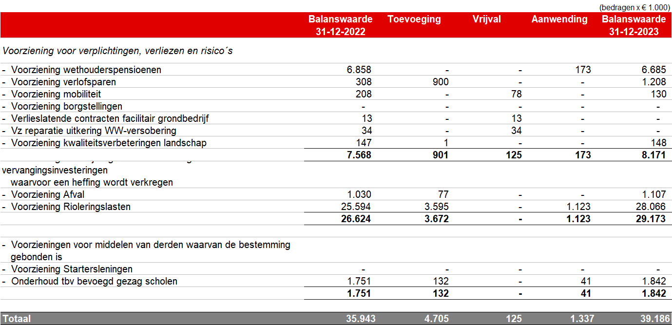 Het verloop van de voorzieningen in 2023 is in onderstaand overzicht weergegeven.